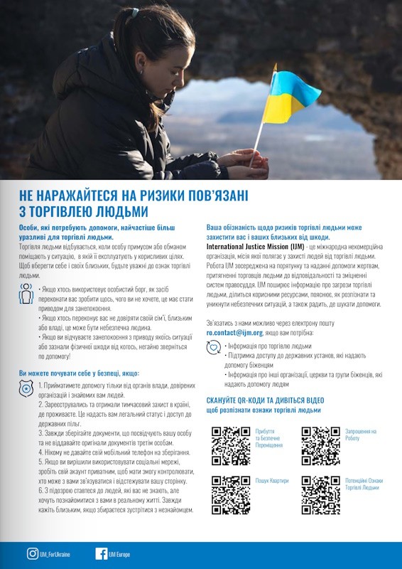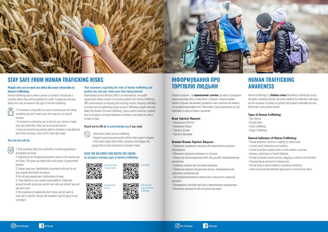 Департаментом міграційної поліції Національної поліції України у співпраці з Міжнародною неурядовою громадською організацією International Justice Mission розроблено буклети, в яких міститься інформація про ризики торгівлі людьми, шляхи їх уникнення, телефони гарячих ліній для отримання допомоги.